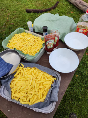 Am Donnerstag war es so weit, die geernteten Kartoffeln der Kinder wurden von den Kindern zu Kartoffelbrei verarbeitet. Was passt zu Kartoffelbrei am besten? Natürlich Fischstäbchen. Also machten sich die Kinder an die Arbeit und schälten Kartoffeln, zündeten die Kochstelle an, stampften die Kartoffeln und brieten die Fischstäbchen.